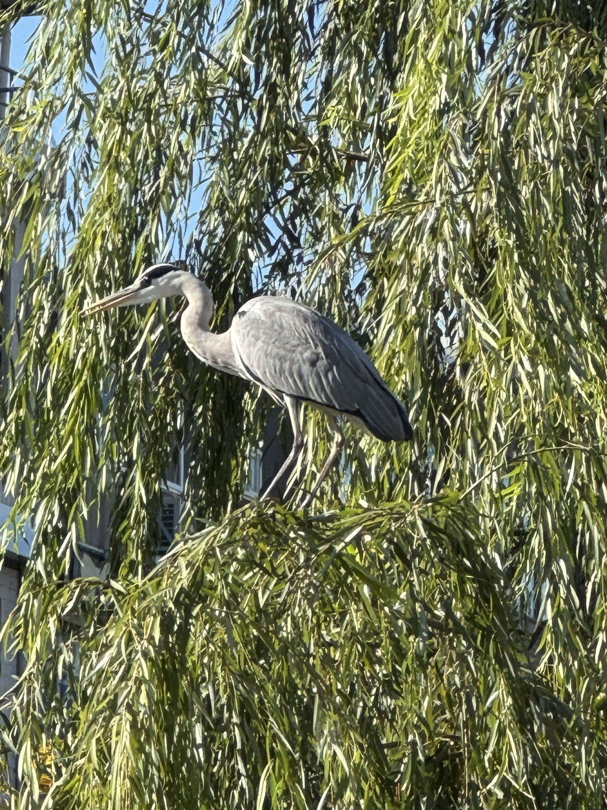 As I walked along the water yesterday, I saw so much life. Blueish koi the size of cats, swimming against the current; schools of minnows; families of pigeons, mallards, and a pair of incredibly pissed-off brown-eared bulbuls harassing a perfectly innocent turtledove. And then I came out from under a bridge, and I saw two enormous grey herons in flight over the water. One landed on a rock in the middle of the stream. The other landed on a willow branch, which swayed precariously under its weight but did not bow.