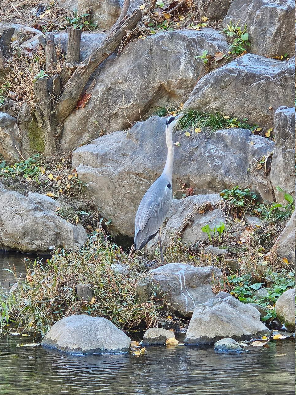 These two huge, elegant birds watched as the people walking along the stream stopped to photograph them. Their bright eyes tracked the movement of phone camera lenses, instinctively watching for the darting flash of fish. This stream had been restored thoroughly enough to become their home.