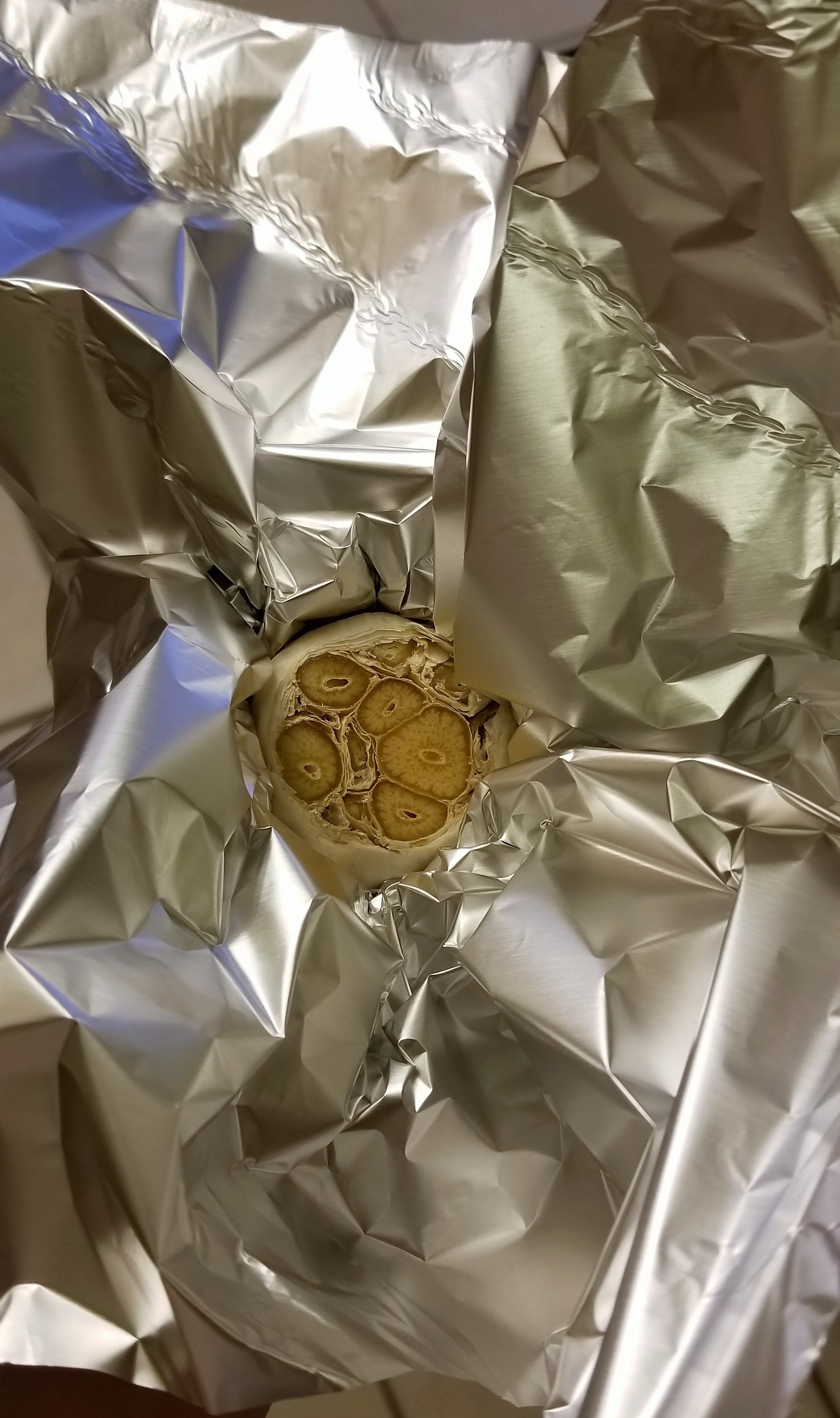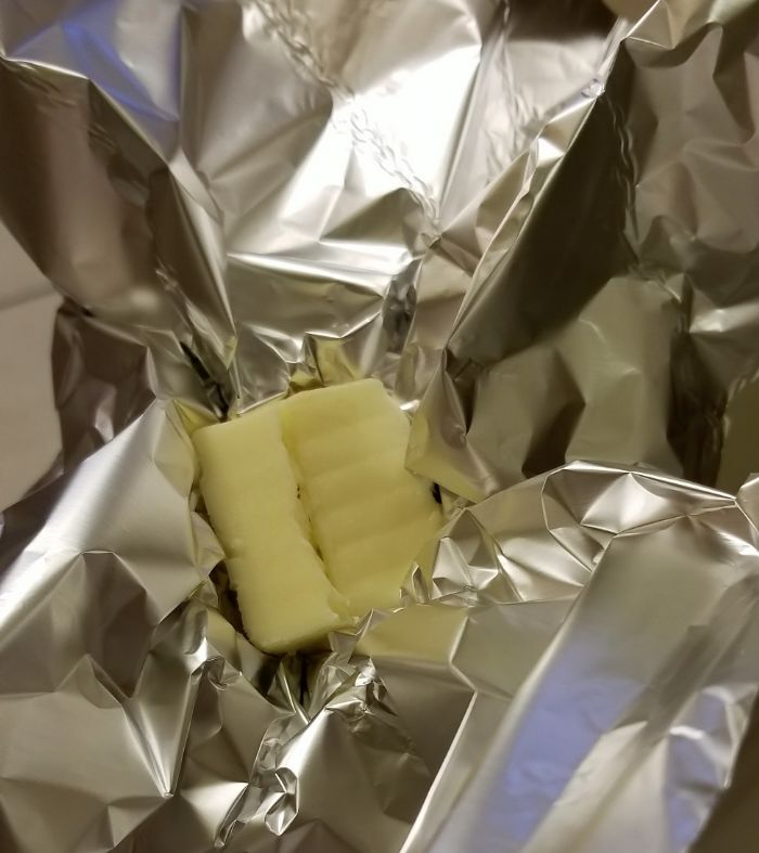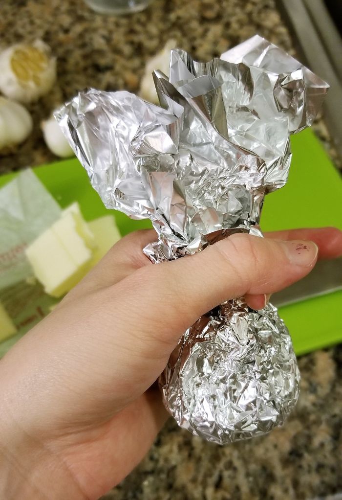 Step 4: Cram Some Butter In There. Completely obscure the exposed garlic cross-sections with butter. Smash it down a little, just enough that it would be tricky to remove cleanly. This is why the tight seal around the sides of the bulb is important: you don't want butter running down the outside of the garlic. You only want butter running down the inside of the garlic.