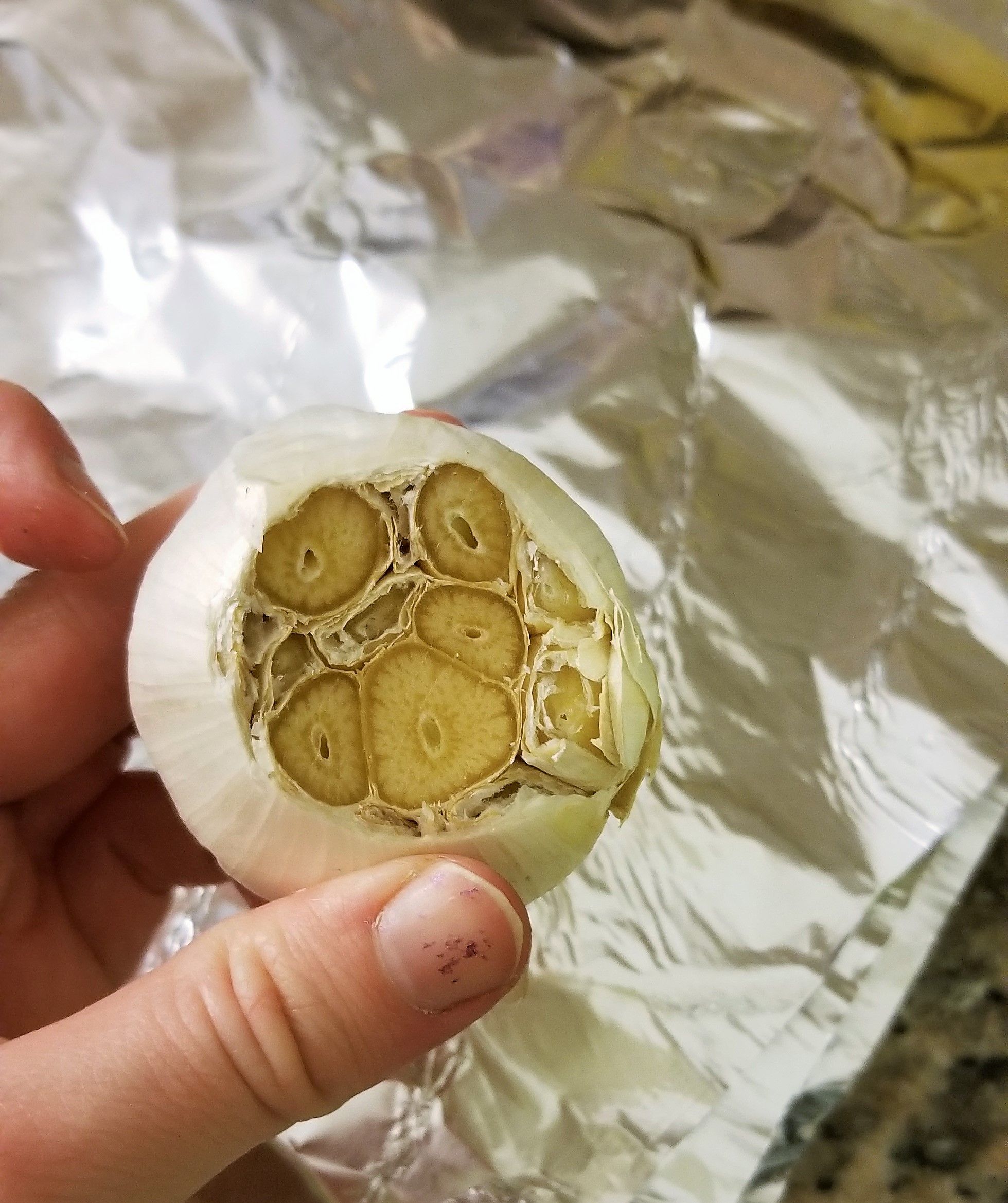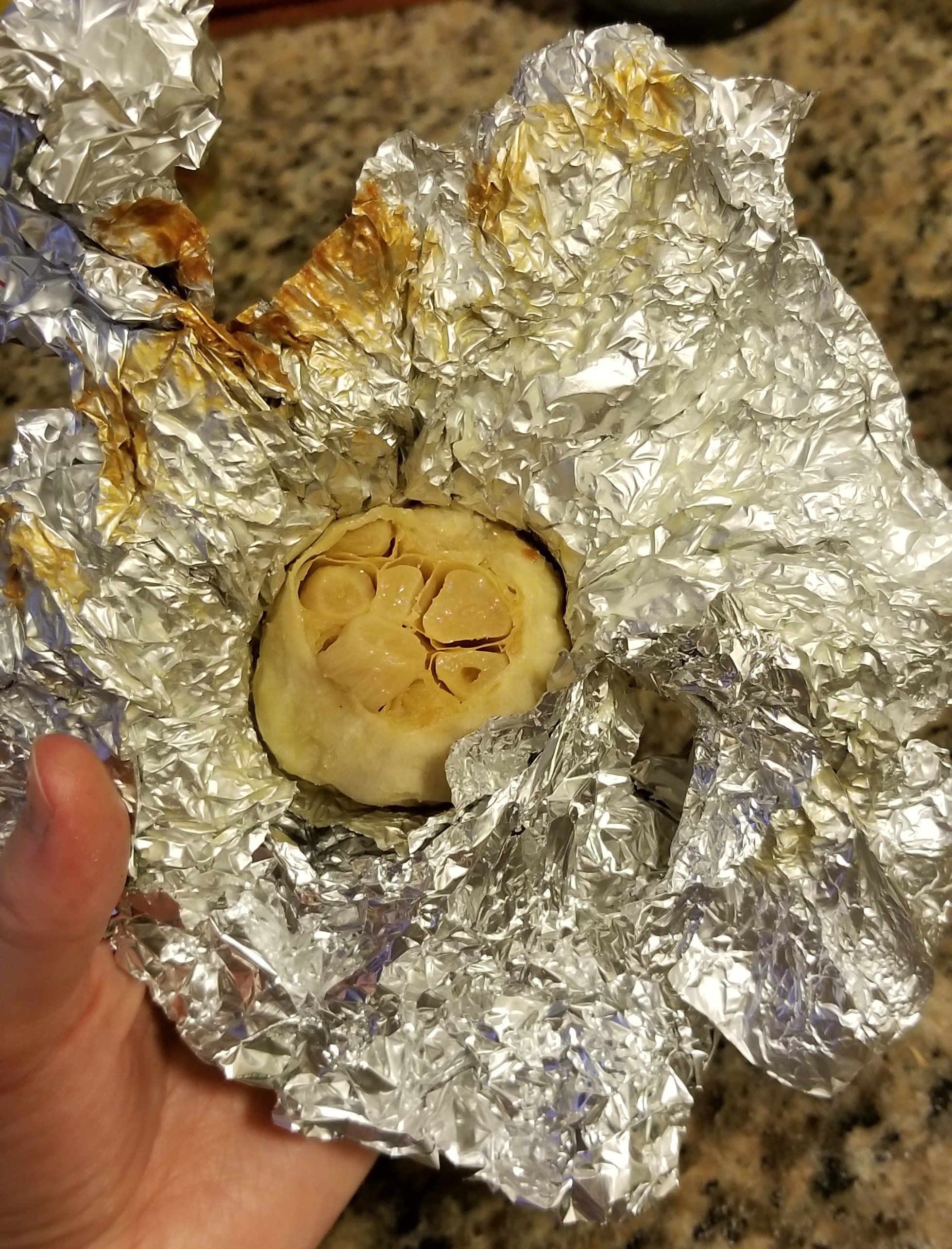 The next morning, this is what you'll have: a whole bulb of roasted garlic, saturated with butter, ready to burst out of its skin. Every hollow place in each clove of garlic is now filled with solidified garlic-butter. It's yours. It's all yours.
