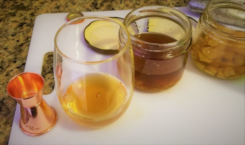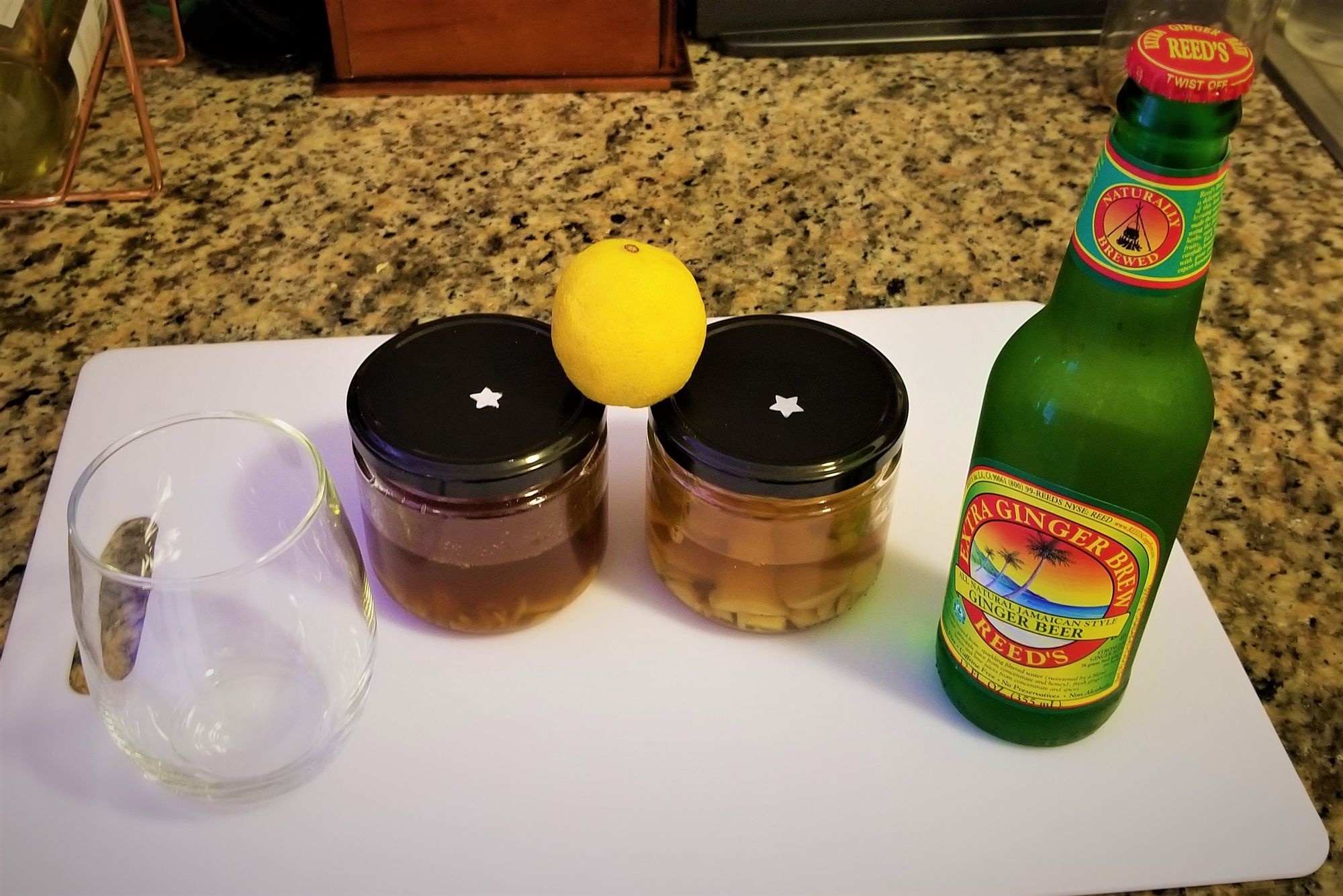 I let these two jars sit for a few hours, so that the ginger could exude its healsome vapors out into the honey and the whiskey. Then, when I couldn't wait anymore, I proceeded to the assembly phase.