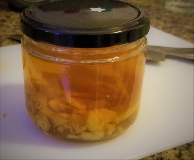 The other half of the ginger went into this jar along with quite a lot of Bulleit Rye. I used Bulleit Rye because I happen to have a huge bottle of it sitting around. I topped up the jar with water because my eyes were burning from the sheer quantity of rye I was pouring into the jar, and I succumbed to cowardice.