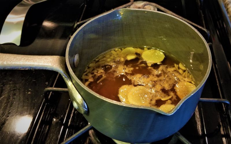 Half of the ginger went into my trusty saucier along with about a third of a cup of raw honey and a third of a cup of water. I boiled it all together until there were bubbles, then let it sit over the dead burner for a couple of minutes to settle. A note on raw honey: I don't have any notes on raw honey. I bought this honey because the jar was cool. Honey raw-ness is something that I should probably have an opinion on, but I just don't know a single thing about it! I don't even know what makes it raw. As a rule, I support bees.