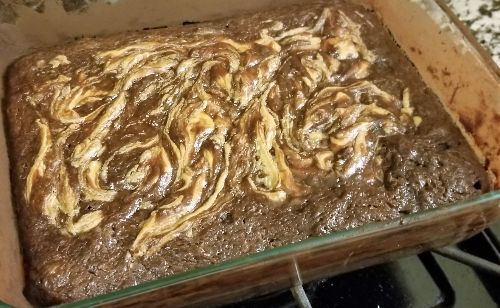 Preheat oven to 350. Grease a 9x9 baking dish and dust it with cocoa powder. Combine dry and wet ingredients separately, then mix them all together. Pour batter into baking dish. Drop dollops of peanut butter onto the surface of the batter and swirl it around with a butter knife. Bake 25-30 minutes.