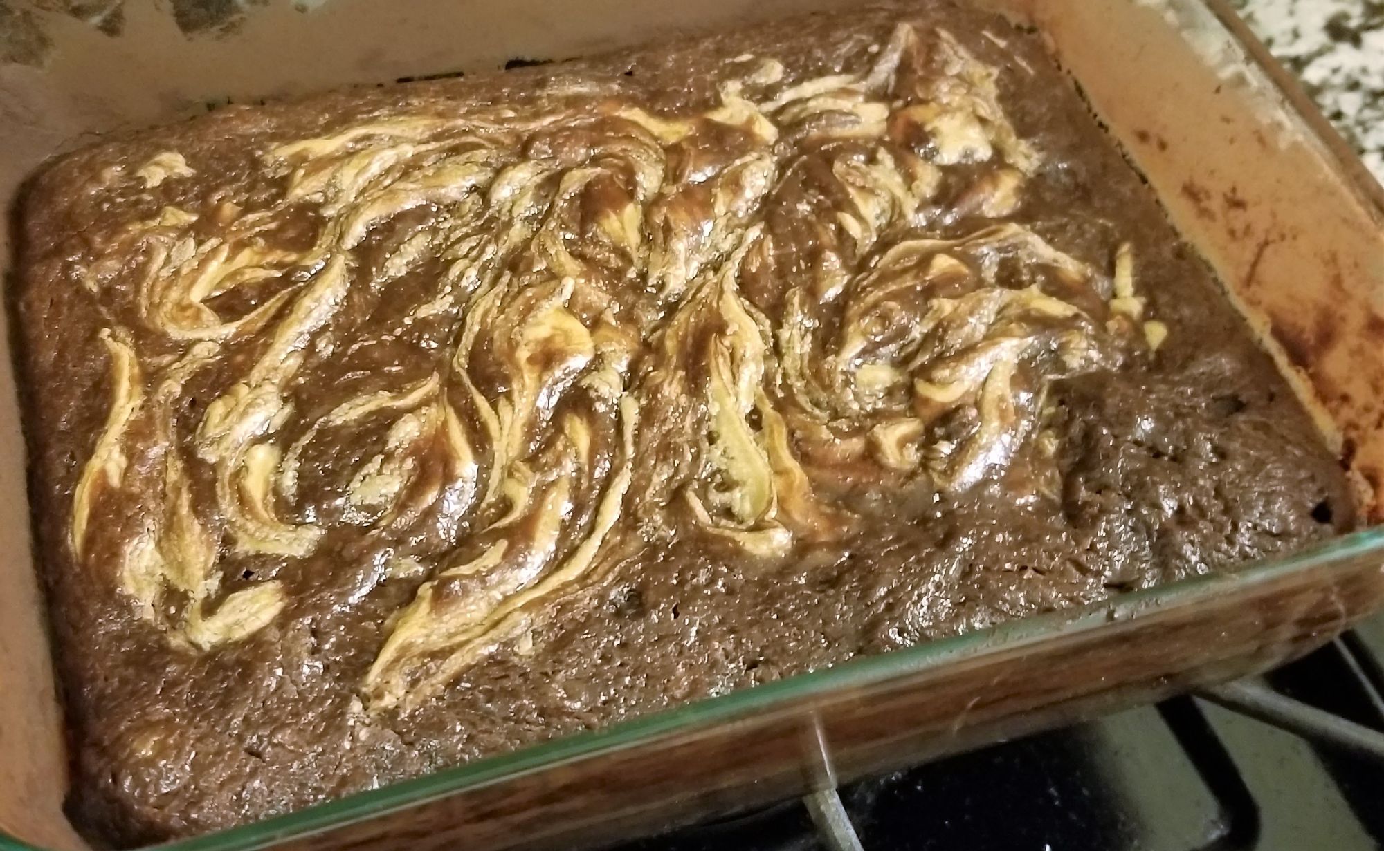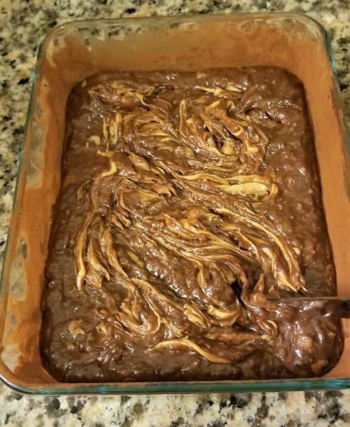 I swirled the peanut butter into my 8x6 pan, muttering "this will be fine, this will be fine," not realizing that I probably should have softened up the peanut butter first so it would actually... you know. Swirl.