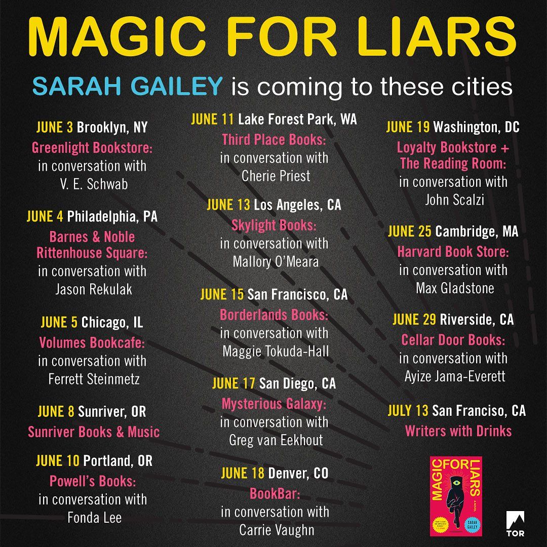 I'm writing to you from the beginning of week 3 of the Magic for Liars Grand Tour! Holy shit, friends! This has been amazing. So far, I've been to New York for BookCon and the Magic for Liars launch event; then, I hopped around to Philadelphia, Chicago, Sunriver, Portland, Seattle, and Los Angeles. Now I'm in San Francisco in a hotel room with an inexplicable quantity of very good fruit in it. From here, I'll be going to San Diego, Denver, Washington D.C., Boston, and Riverside! If you're in any of those cities, come say hello - there's a graphic with more specific information at the bottom of this email.