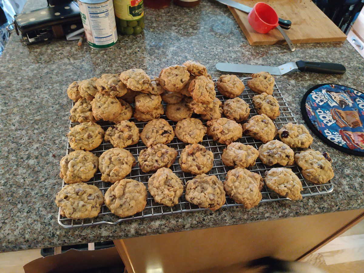 The recipe is simple. 1 cup (2 sticks) of butter, creamed together with 1 cup of sugar and 1/2 cup brown sugar until it’s light brown and fluffy. Add a glug of vanilla extract that your friend Sarah Gailey left behind when they moved, and smile as you think about them being pleased at you using this high quality shit. Beat two eggs in a glass, and then add them one at a time, beating the mixture until well combined.
