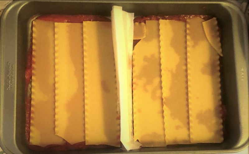 Layer one is sauce. Spread a thin layer of it on the bottom of a 9" x 13" pan.