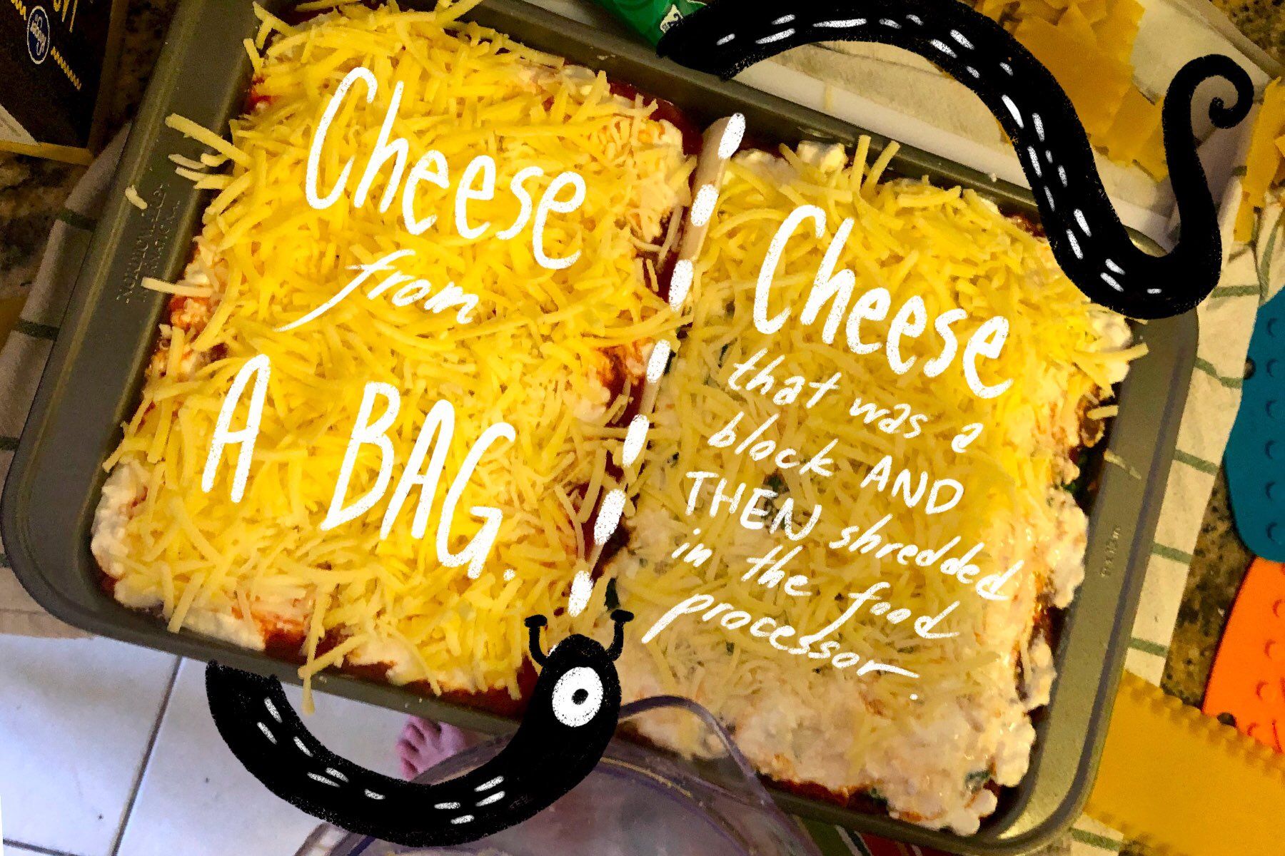 - To increase the difficulty level, shred your own cheese. I like a combination of Monterey Jack, Mozzarella, and White Cheddar. I bet a little bit of smoked gouda would be exceptional in this and only this context. For this experiment, I tried out the cheese-grater attachment on my food processor, and damn, it's a game-changer for my arthritic hands. That said, in this context, I really didn't notice a difference between the flavor or texture of the pre-shredded stuff and the fresh-shredded stuff. And I'm kind of an anti-pre-shredded-cheese snob! But it truly wasn't worth the effort in this particular case, so don't feel bad if you go with the bagged cheese on this one.