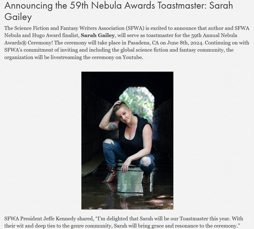 This week SFWA announced that I will be the Toastmaster at this year’s Nebula Award Ceremony! I am deeply honored by this role and can’t wait to celebrate the luminaries of SFF.