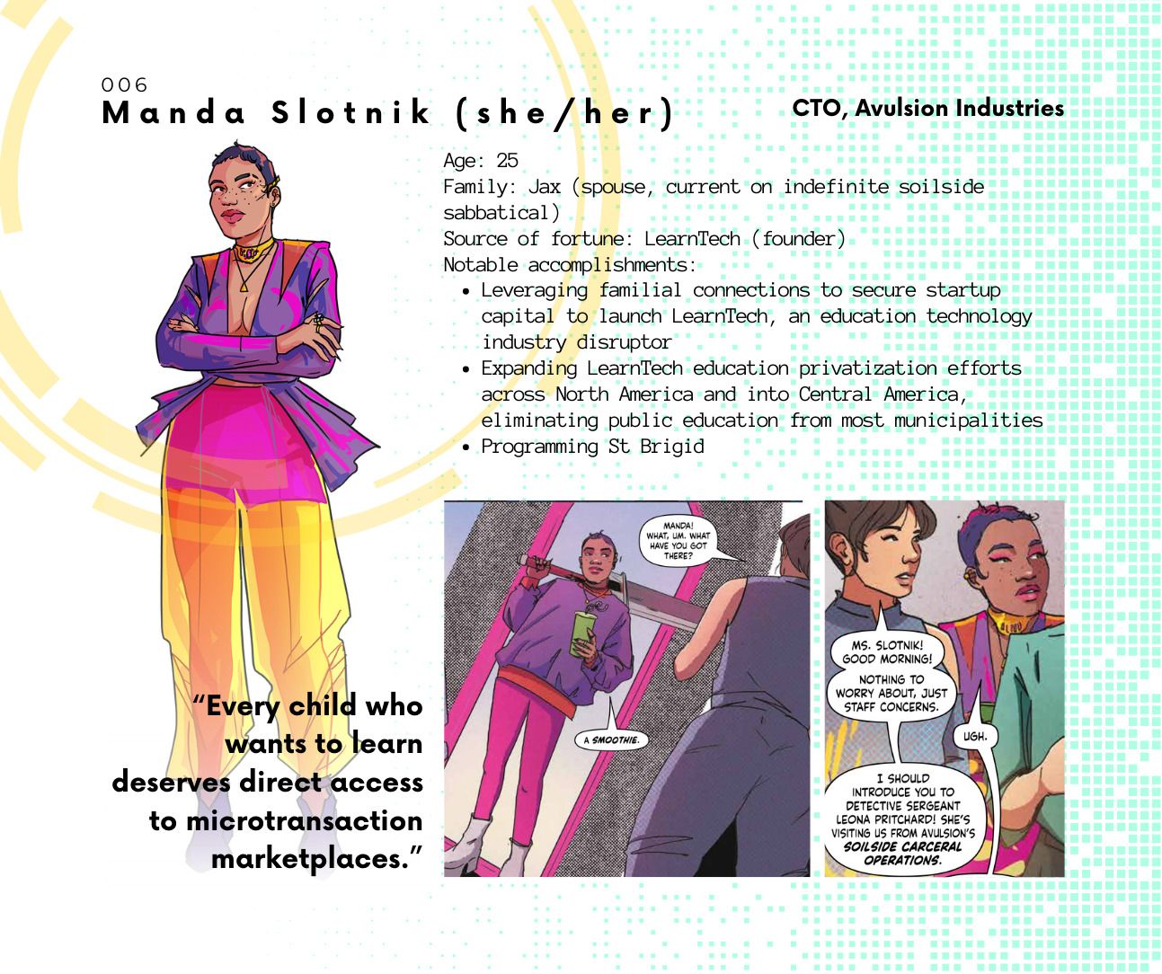 KNOW YOUR STATION comes out in trade paperback in just a couple of short weeks! Liana Kangas and I are sharing some peeks behind-the-scenes on Instagram. For the next few days, we’ll introduce a few of the billionaires that live on THE FIRST RESORT, the space station where the story takes place. First up: Meet Manda Slotnik.