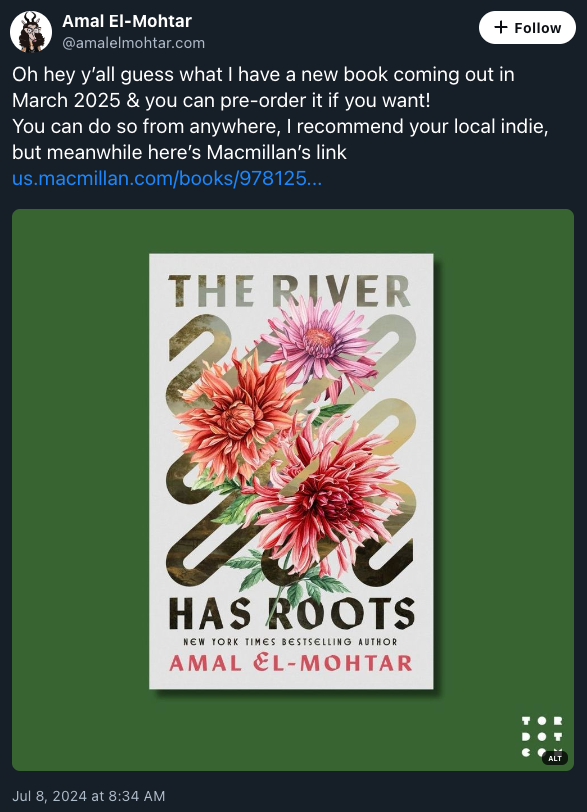 Friend of the newsletter Amal El-Mohtar has a new book coming out! The River Has Roots drops in March. I guarantee this one will be flying off the shelves, so pre-order your copy now to make sure you don’t miss it!