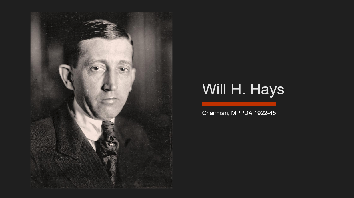 Under Hays, the MPPDA steered Hollywood into a culture of pre-emptive compliance. This was a kind of compliance that Hays, alongside his colleagues Martin Quigley and Daniel Lord, were more than comfortable with. Together with several studio heads, those three led the process of creating a code that would define acceptable content in American cinema from 1934-1968. Although the Hays Code (as it was known) would be formally retired in the late 60s, the ripples caused by the code are with us in this room today.