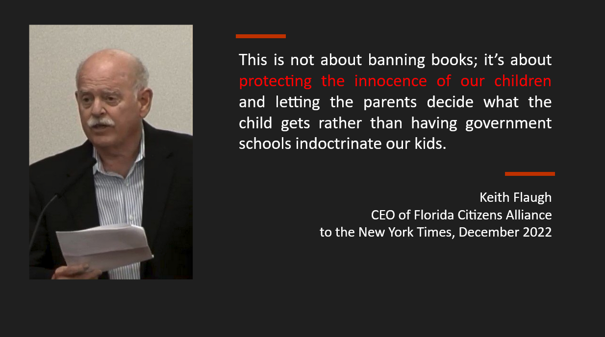 These are the goals supported by contemporary book banning efforts by groups that claim to be “protecting children” like Moms for Liberty and the Florida Citizens Alliance.
