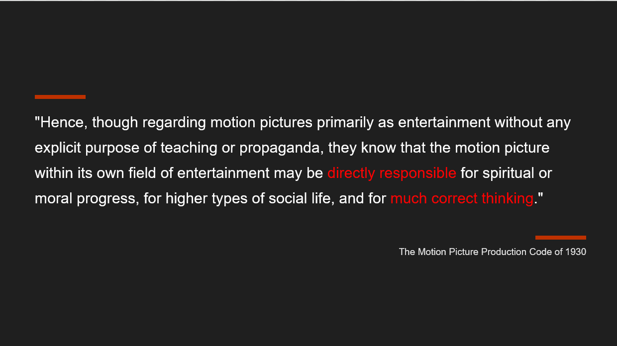 The immediate goal is control over what narratives people are exposed to. The terminal goal of that effort is control over people’s actions. The path from point A to point B is one of moral instruction: Using narrative limitation to change the way people think about what is or is not acceptable. We can see this explicitly outlined in the text of the Hays Code: “The motion picture within its own field of entertainment may be directly responsible for spiritual or moral progress, for higher types of social life, and for much correct thinking.”
