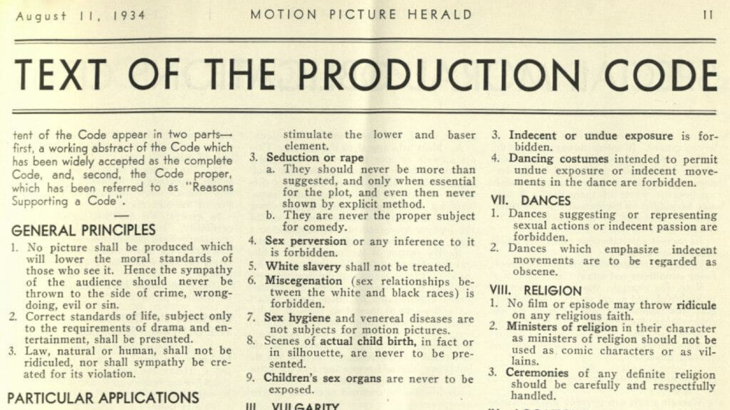 So what was the Hays Code? It went through several iterations, including a loose but effective lists of “Don’ts and Be Carefuls,” but here’s the version that lasted: