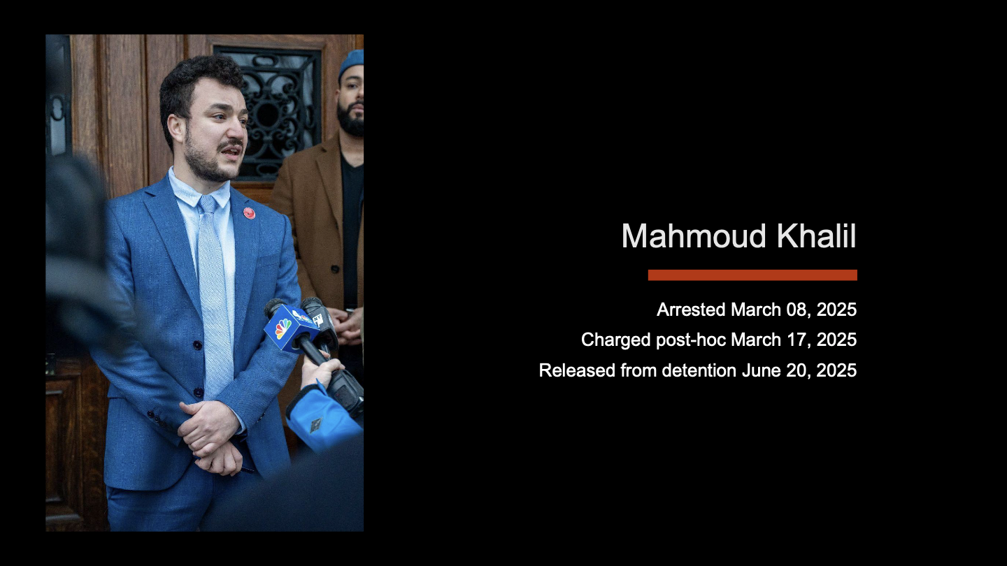 It is of course impossible to know how Mahmoud would have been treated if he'd been a Kyle instead of a Khalil, but the rhetoric inflicted upon him by the State and its allies took full advantage of every possible weaponization of his identity—including but not limited to referring to him as a terrorist, in spite of no evidence of any activity on his part that could possibly be interpreted as such. This is just one example of the way the State is prepared to use identity as a cudgel.