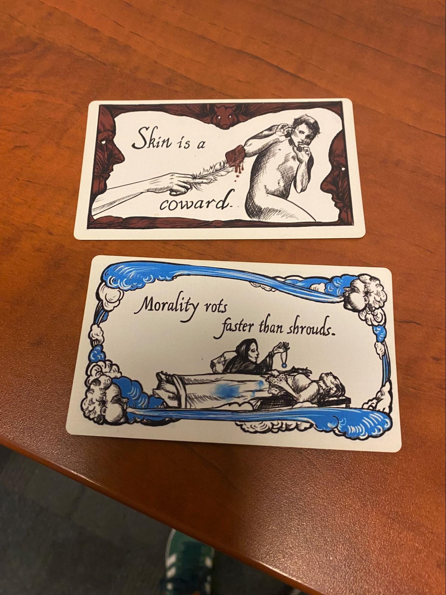 Here is the story I wrote during that twenty minutes in response to the cards we pulled, one of which featured a grave robber and one of which featured the phrase “Skin is a coward”.