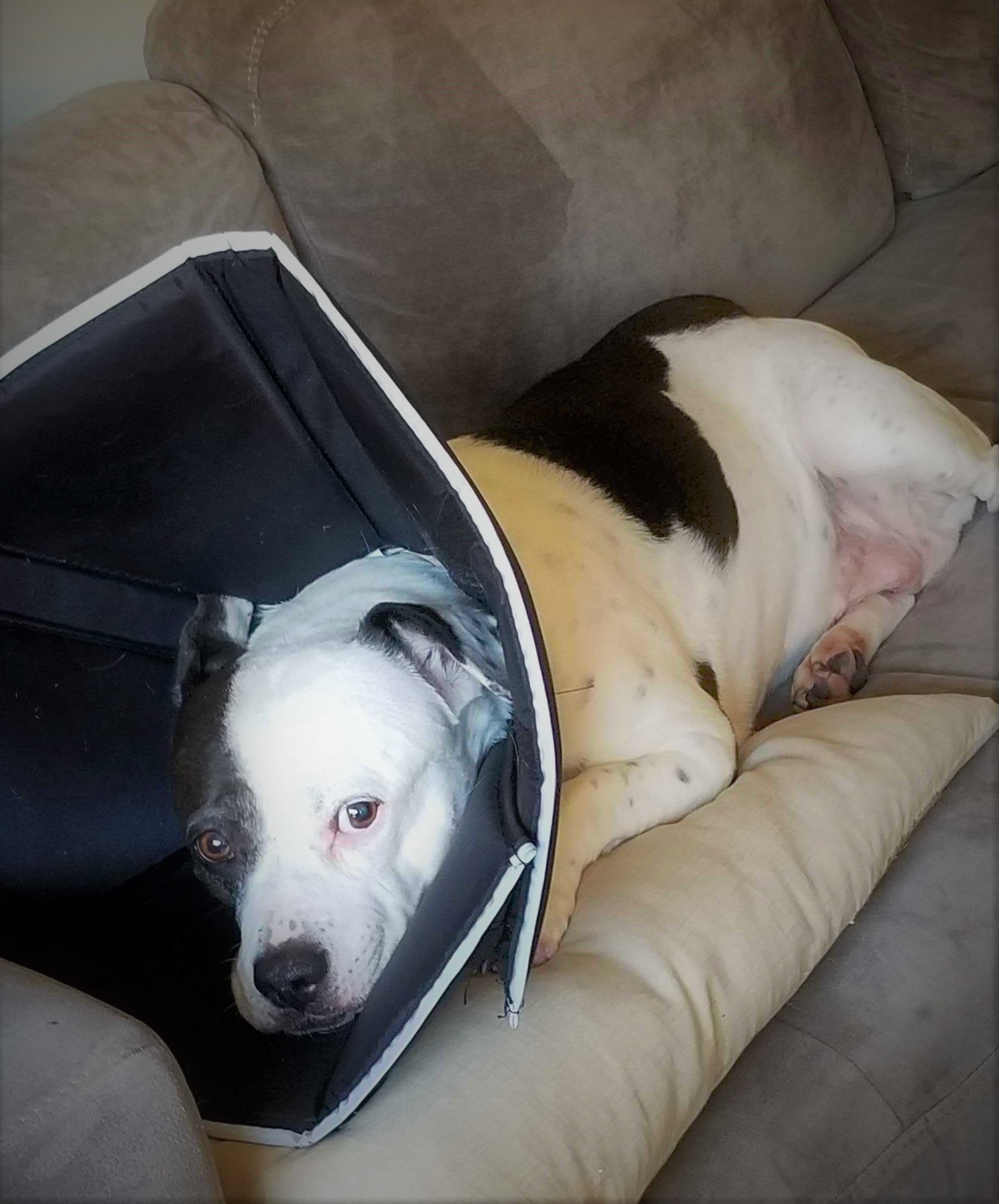As promised at the top of the post: because I don’t have picture of food, here is a picture of Tinkerbell, who is very sad to have to wear the stop-chewing-your-paws cone.