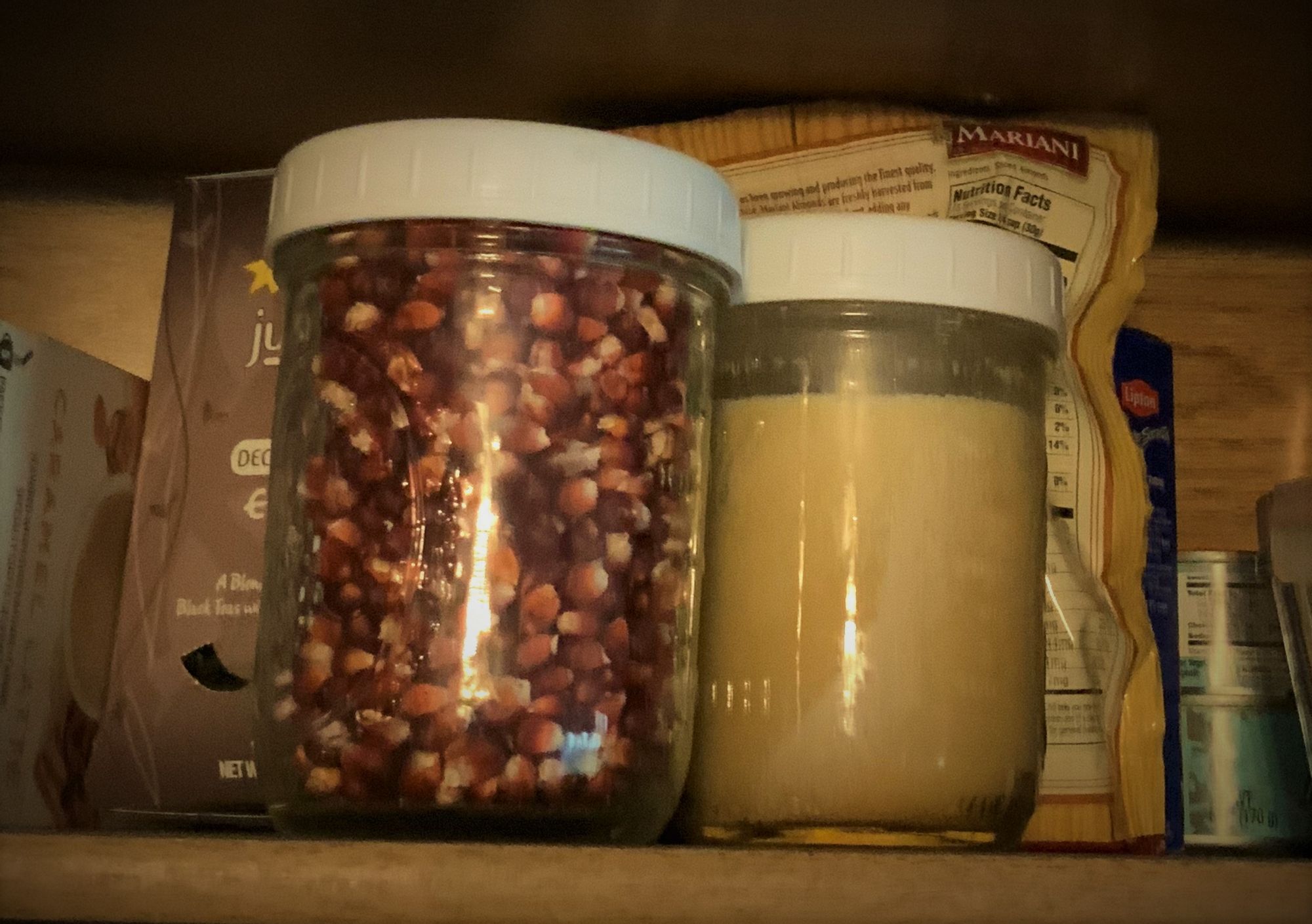 Step One: Soak it. One cup of dried corn wants two cups of water plus a little salt. Soak it for two hours.