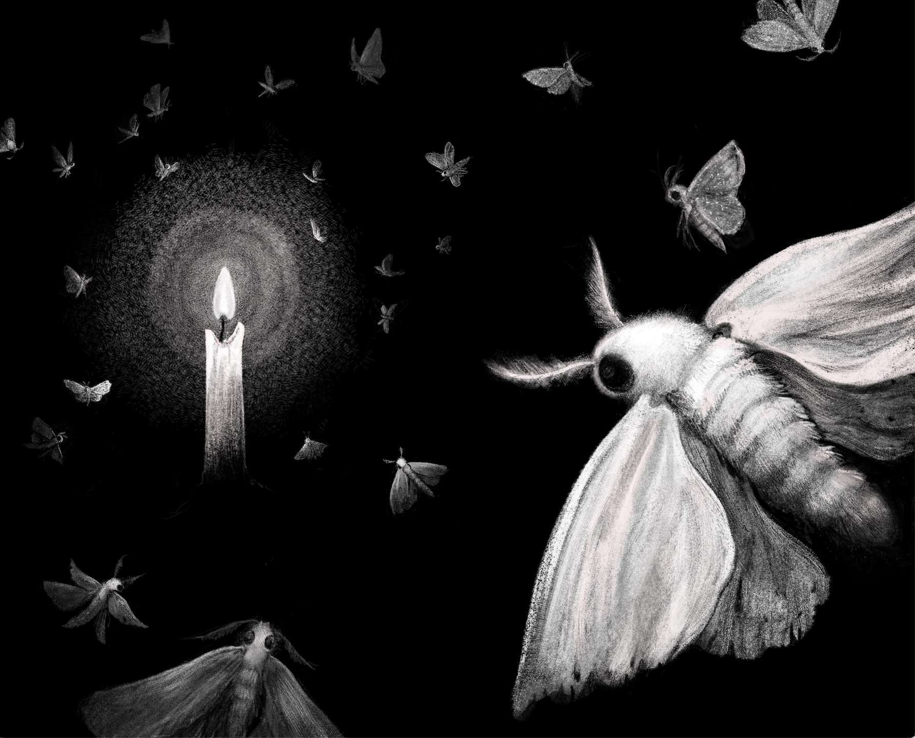 Kingfisher: Oh god, I wish I had a suitably impressive answer for this, some mystic connection to the book or whatever, but truth is, I was a commercial illustrator for nearly two decades, and there is absolutely no mysticism left. (Honestly, that’s why I mostly got out of it.) My process is basically “Okay, what’s a nicely iconic image from the book that won’t drive me nuts to draw?” Usually I wind up with an animal, because most of my books end up featuring animals in some fashion. For Feasts, I sat down and said “Time to draw some moths!”