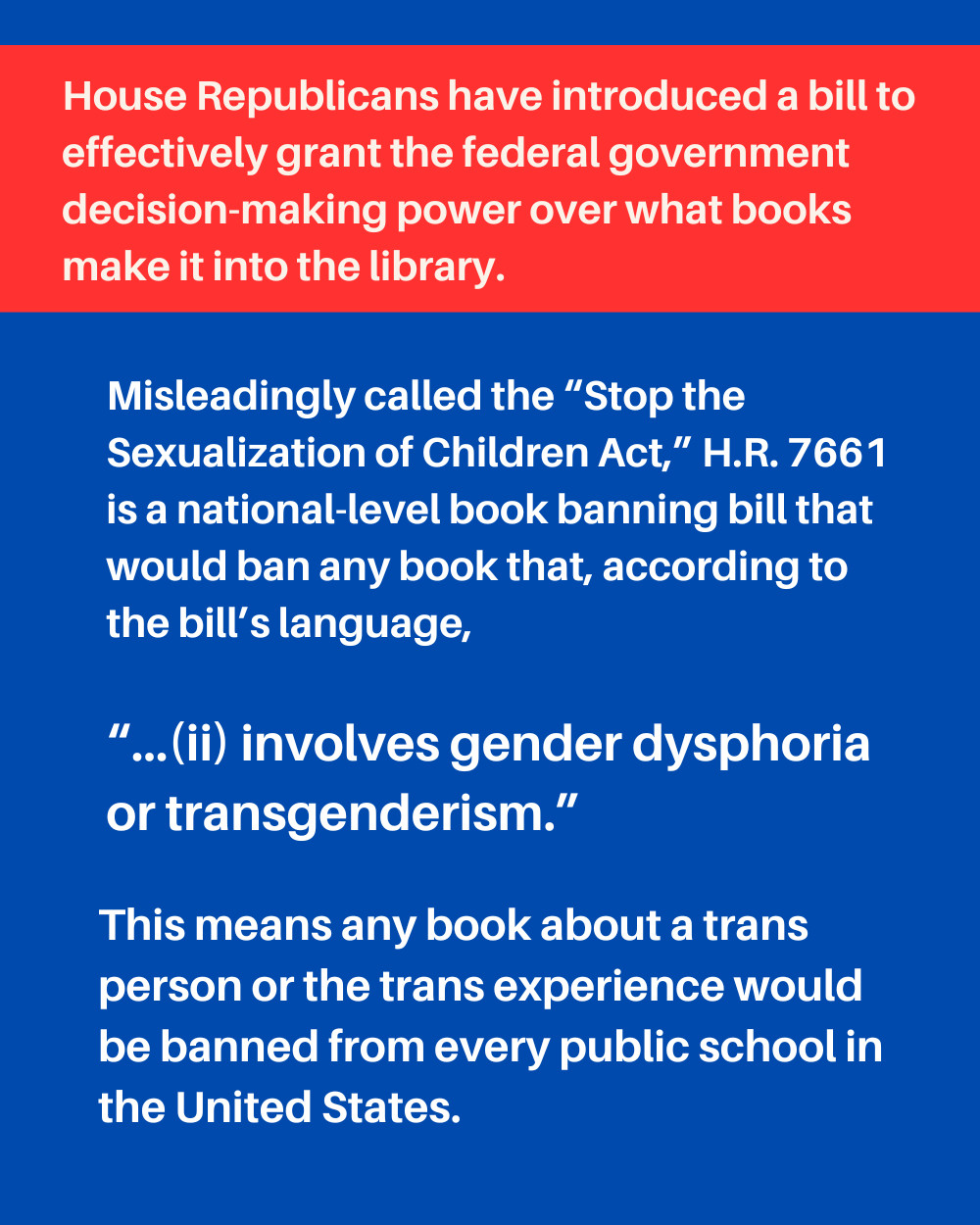 We must never, ever let anyone take art away from us – but the government of the United States is trying. H.R. 7661 is a national book-banning bill that explicitly targets books about trans people across the United States. It is called the “Stop the Sexualization of Children Act” – a title that misleadingly implies the bill, or those who are backing it, have the well-being of children in mind at all. From our friends at Authors Against Book Bans, here is some more information: