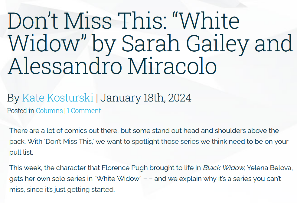 In issue #3 of White Widow, Yelena finally gets to do what she does best. Armament Industries is about to meet its match – and Yelena is about to learn what kind of threat is truly facing the world of assassins. Pick up your copy of issue #3 at your friendly local comic shop or your digital store of choice. And if you’re on the fence about whether to give it a read, check out this incredible review from Multiversity’s Kate Kosturi!